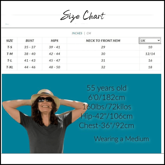 Love my scoop neck tee. I’m only 5’5” so not tall and I ordered a small. It covers really well (my dairy-air) and is so comfy. It washes great and feels super soft against the skin. I love both necklines. I now have one of every colour! Thanks Miss Sassy!!!